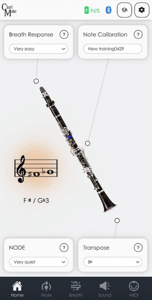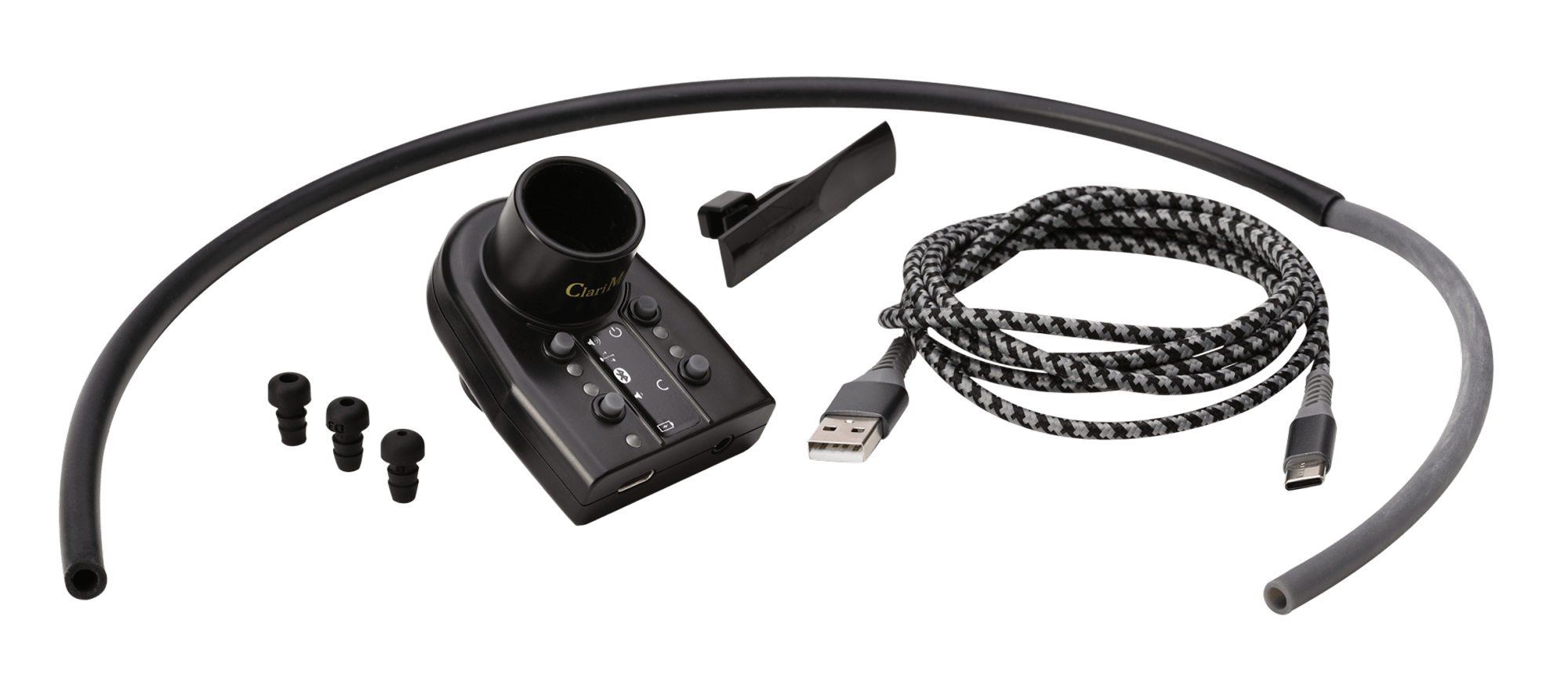 構造は至ってシンプルで、マウスピースとバレルの間にClariMate本体を装着し、付属の専用リードとチューブを装着。ClariMateとPC・スマホをUSBケーブルまたはBluetoothで繋ぎ、アプリを立ち上げ、ヘッドフォンで自分の演奏をモニターするというものだ。専用の「アクティブリード」がアンブシュアと息を感知し、管の内径に差し込む「チューブ」が運指を感知。ClariMateを介してデジタル音に変換され、音が鳴るという仕組みだ。クラリネットをデジタルに変換してしまうというその発想力には脱帽だ。