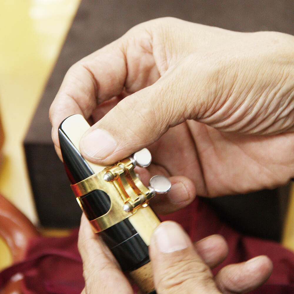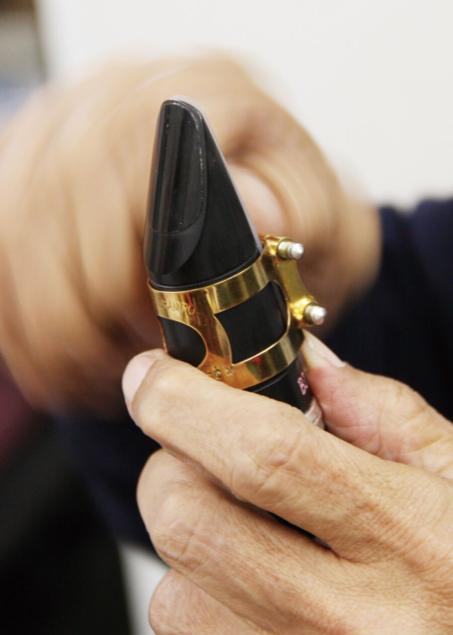 マウスピースのお手入れの仕方は人それぞれ違うだろう。扱い方について十亀氏は、「むやみにスワブを通さないこと。汚れてきたと思ったら、表面をキズつけないように水洗い(編集部注:変色するので水洗いはダメだという説もある)をすればいいと思います。また、マウスピースは意外と軟らかいのでリガチャーを締めた状態でリードを下に動かすと、マウスピースのフェイシングが削れてしまうことがあるので注意してください。そしてリガチャーを取り付けるときは最後まで締めず少し緩めておいて、リードをセッティングしたあとにリガチャーを締めるようにする。そして片付けるときは必ずキャップをすること」と語ってくれた。