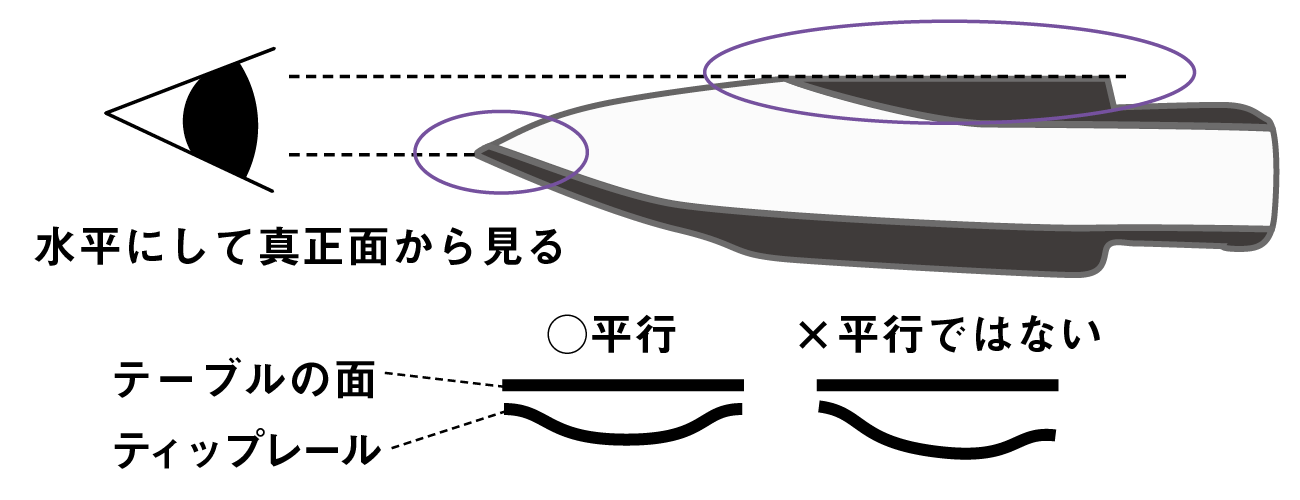 そこで、実際にティップオープニングの左右の開きを調べる方法として、図のようにマウスピースをティップ側から正面に見てみよう。ティップレールの左右両端とテーブルが平行になっているかを確認してみて、この開きが大幅に違うものは、精度が高いとは言えない。