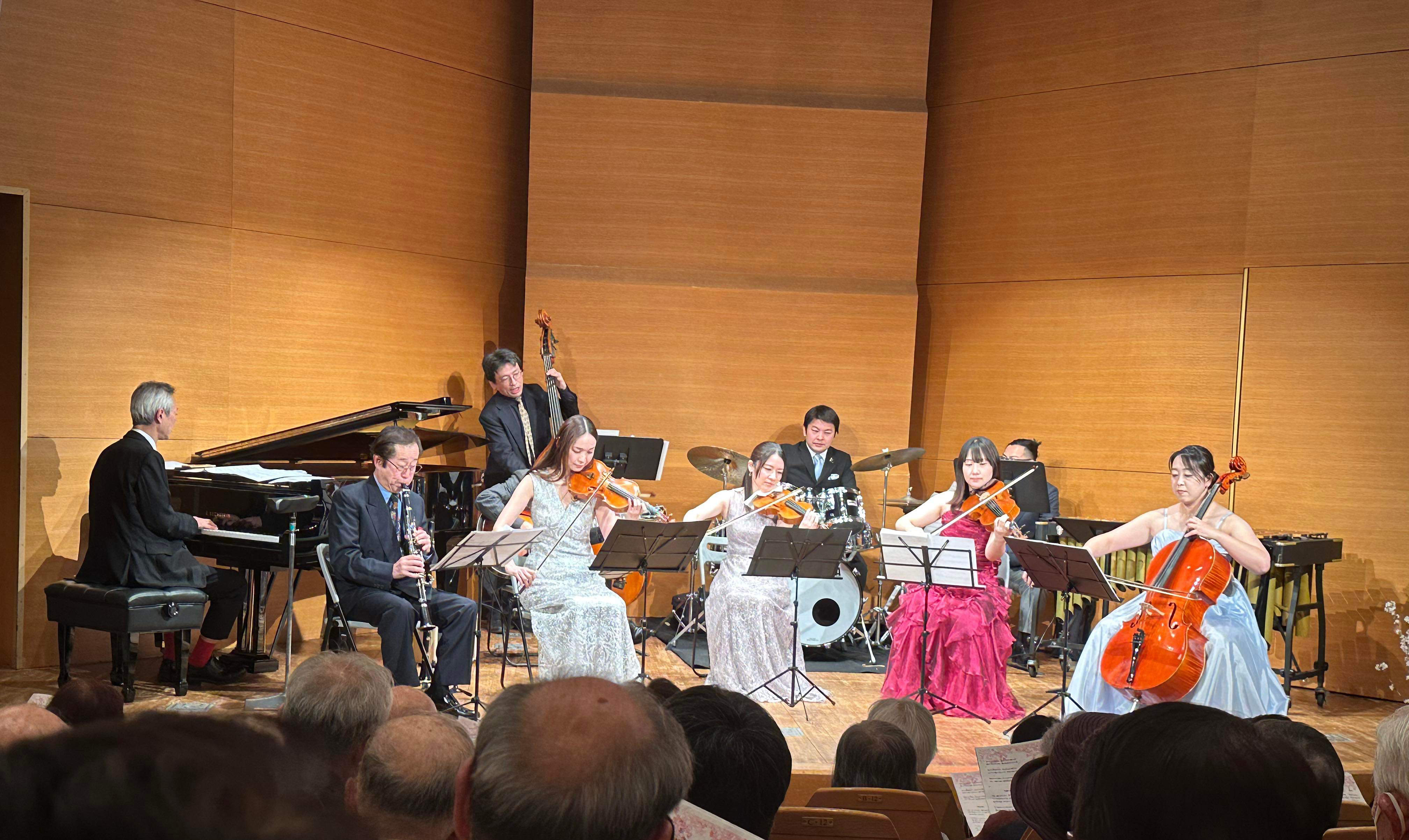 クラリネットをはじめ、ピアノ、ギター、ヴィブラフォン、ウッドベース、ドラムのジャズコンボに、ヴァイオリン2本、ヴィオラ、チェロの弦楽四重奏を加えた、とても珍しい編成。花岡さんの紹介の後、弦楽四重奏の美しいクラシック演奏からコンサートがスタートしました。そこにバンドと花岡さんが加わるのですが、花岡さんの暖かく艶やかな音色が響くと、圧倒的な“花岡ワールド”に引き込まれます。