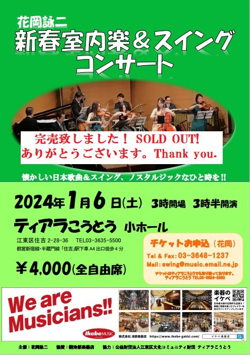 日本を代表するジャズクラリネット奏者、花岡詠二さんの新春コンサートが1月6日(土)に“ティアラこうとう 小ホール”にて開催されました。