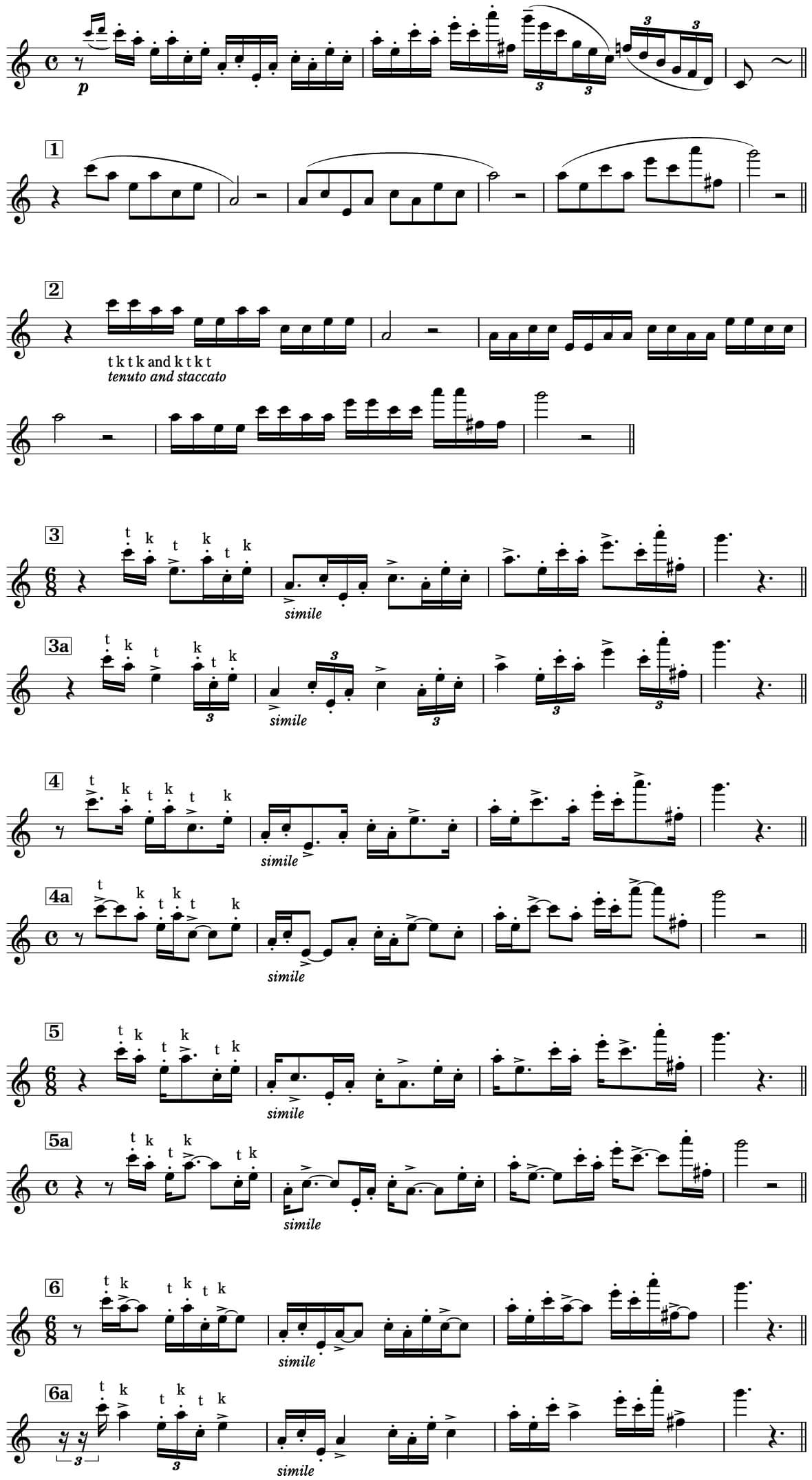6では付点のリズムにダブルタンギングを合わせて練習します。この時もメロディラインの音質に注意しましょう。