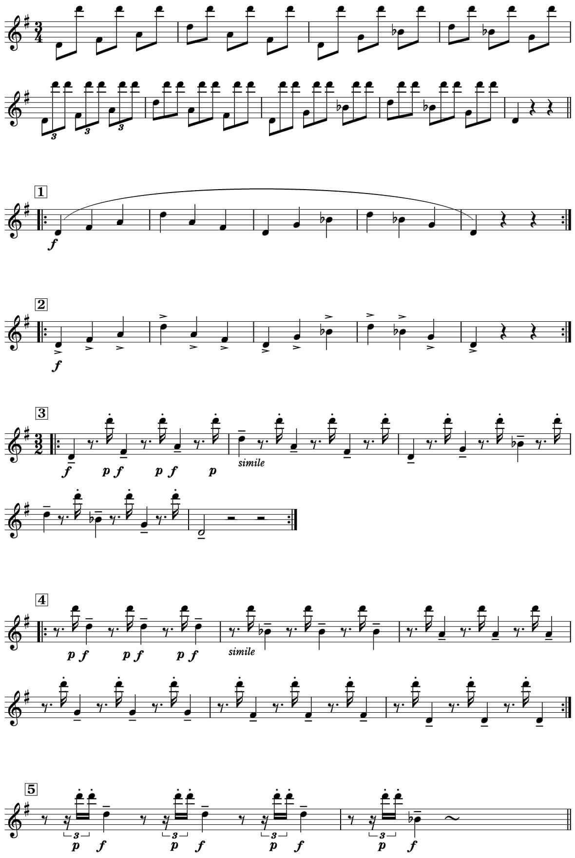 音程の間隔が広いほど難しいので、4では最も間隔が狭いものから広いものへ並び替えてみました。同じ下降形を3回続けて吹くことによってコントロールの方法がわかってきます。