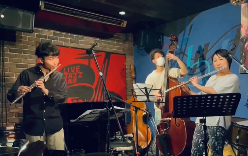 著者近影。太田朱美さん、清水昭好さんとのライブの様子第1回目ですから、今回改めた連載のタイトルの由来についてと、それにジャズを吹くフルート奏者は一体どんな練習をするのかといったお話を交えて、綴っていこうと思います。そこに果たして共通項なんてあるのか……? あるのです。まずはタイトルのお話から致しましょう。