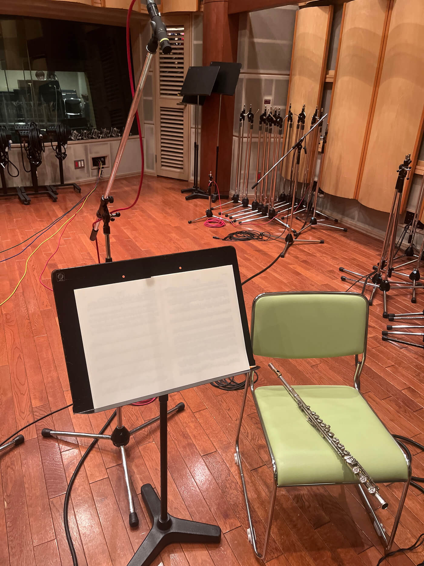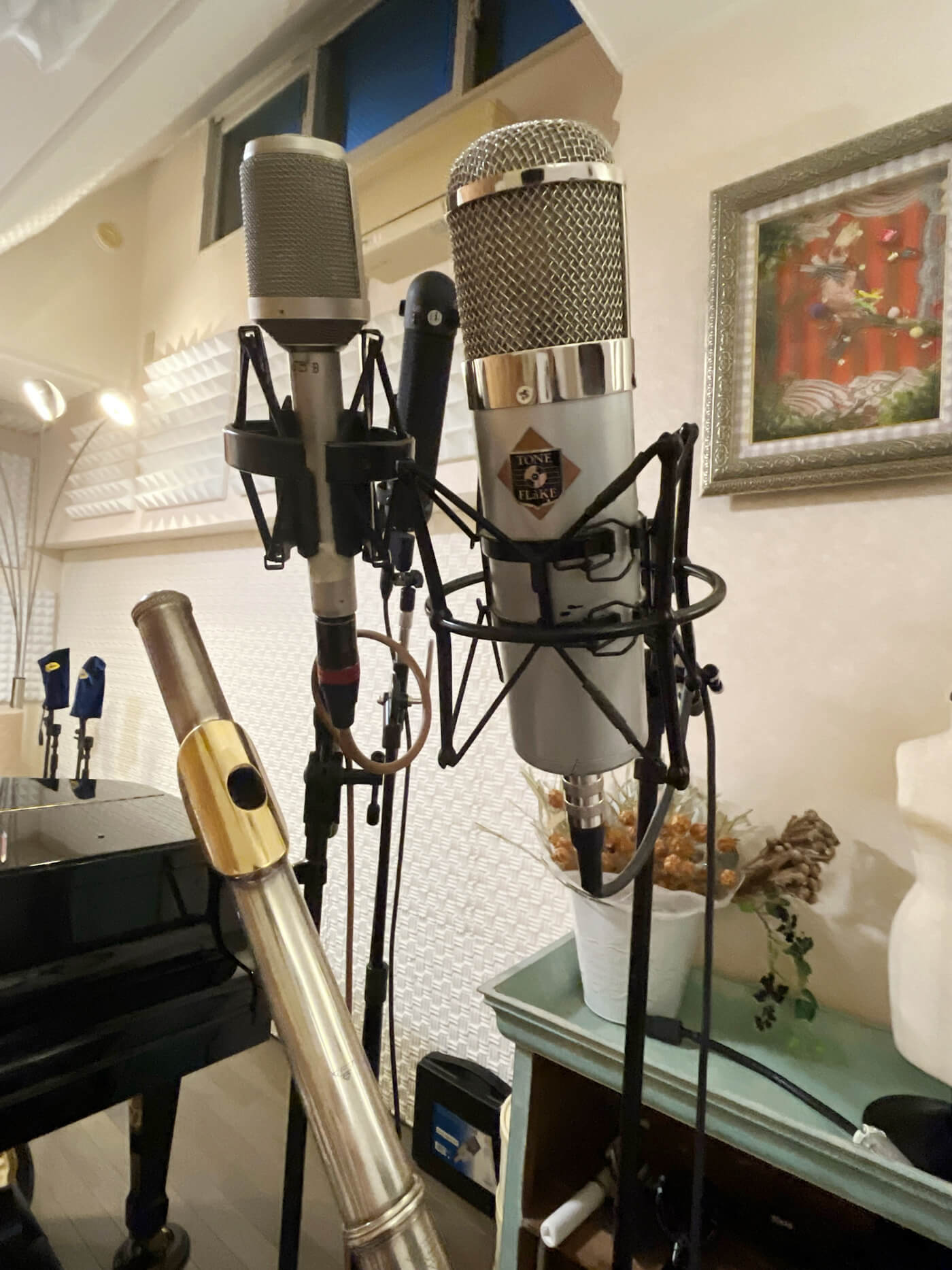 マイクにも色々と種類があり、レコーディングの時には大体コンデンサーマイクや、リボンマイクと呼ばれる種類のものを1本〜複数本立てていただいています。複数本の場合は、比較的近くで鳴っている音の成分を録る物、空間の響きの成分を主に捉える物、のようにマイクの性質を生かしてそれぞれで録音し、最終的にエンジニアさんがそれらの録り音を混ぜて、リアルな音質を形にしてくれます。そのため、エンジニアさんの個性で出来上がってくる音が様々だったりするのですが、あくまでも「自分の音」がその音楽の世界観に合う形になって録音作品の一部にしてもらえる感覚があるので、吹いている本人としても楽しい要素の一つです。