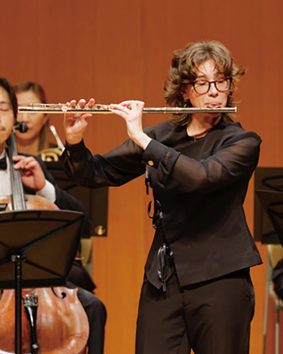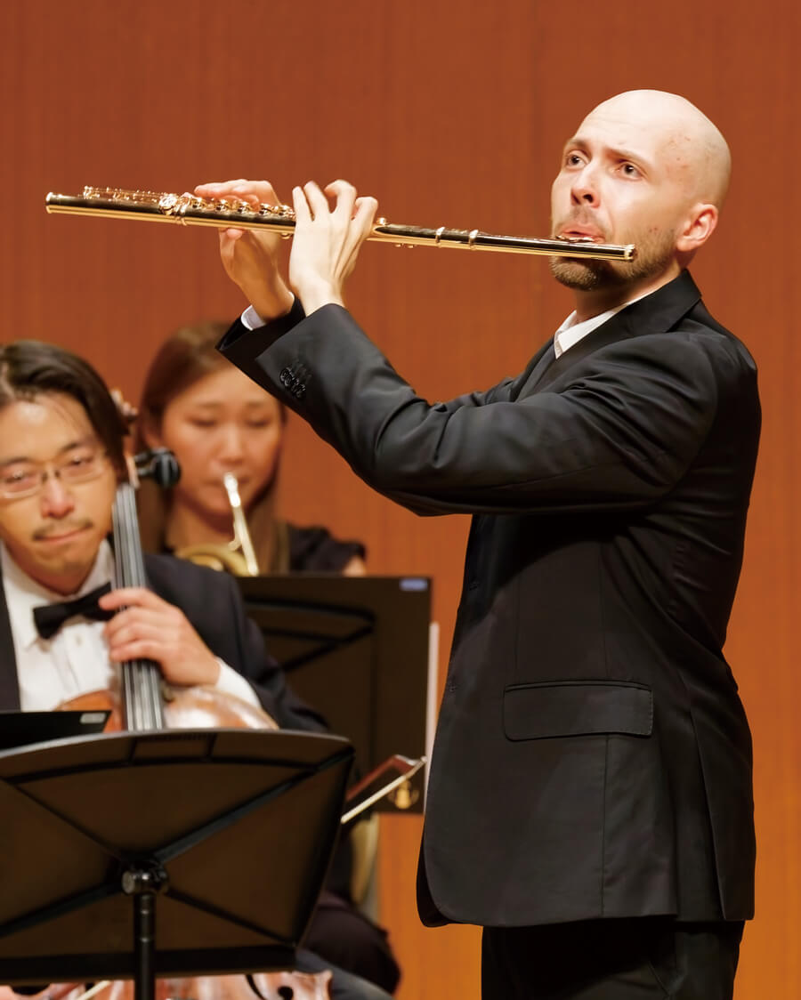 1曲目はシルヴィア・カレッドゥさんと岡本さんによる、エネスコ『カンタービレとプレスト』の演奏でコンサートは幕を開ける。アンサンブルの妙技が光り、何とも美しい「カンタービレ」と、情熱的な「プレスト」に思わず聞き入ってしまう。2曲目のティモシー・ハッチンスさんと鈴木さんによる『ハンガリー農民組曲』では、ハッチンスさんの内面からあふれ出るような表現と、語り歌うような演奏がホールいっぱいに響く。続くグリーグ『ソナタ第2番』は、アンドレア・リーバークネヒトさん自らが編曲。パワフルでハリのあるフルートと、抜群の安定感がある上野さんのピアノによるアンサンブルだ。前半最後はアンドレア・オリヴァさんと岡本さんで『「フランチェスカ・ダ・リミニ」による幻想曲』。オペラのドラマティックさを彷彿とさせる演奏で、技巧が必要となる場面も軽やかかつ華やかに。会場も大いに盛り上がった。