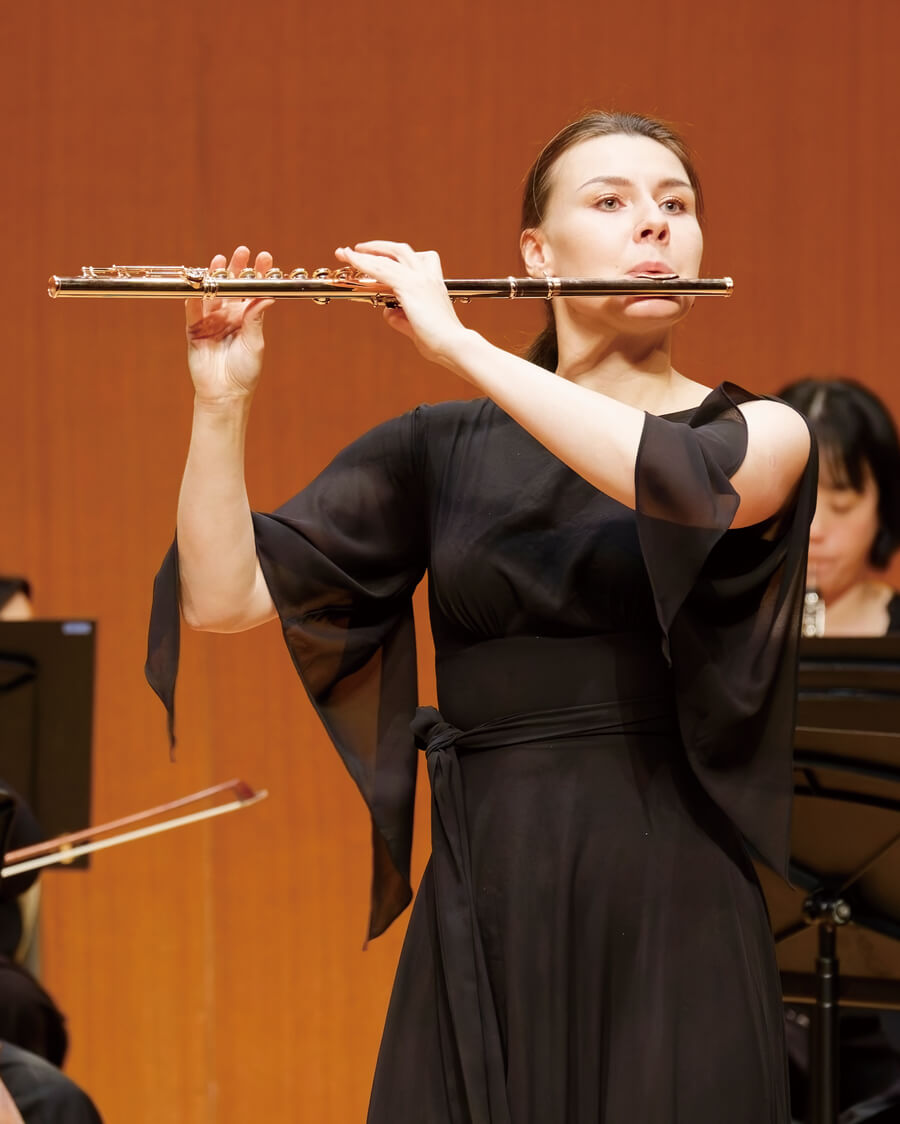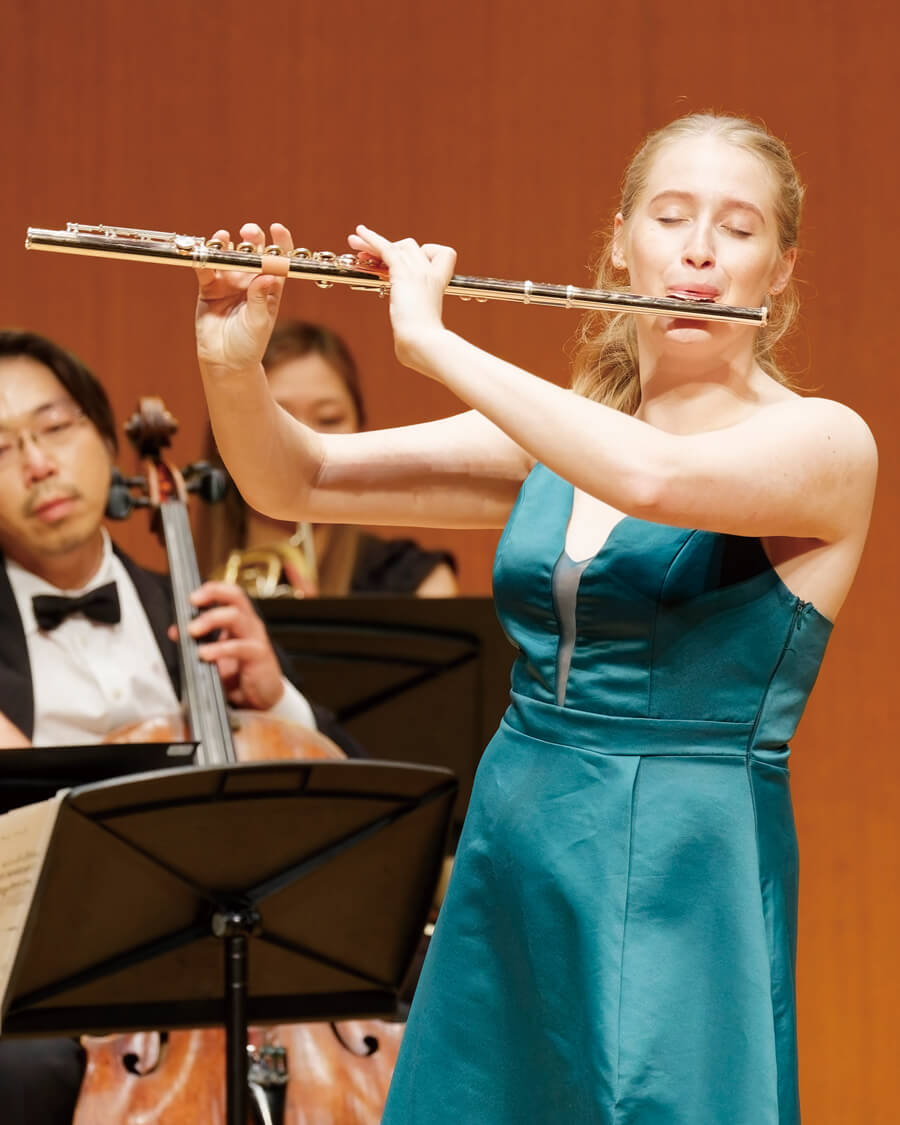 後半は神戸市室内管弦楽団と優勝者2名により、モーツァルト『フルート協奏曲 第2番』が演奏された。第1楽章はチェラッキさん。パッセージやニュアンスを丁寧かつ精巧に演奏し、トリルや装飾音も自然で鮮やかだ。第2・3楽章はエッガーさんで、ぼやけやすいアーティキュレーションも微細にコントロールされ、心地よく耳に届く。本選よりもさらに自由度が高く、カリスマ性を感じさせる演奏だった。