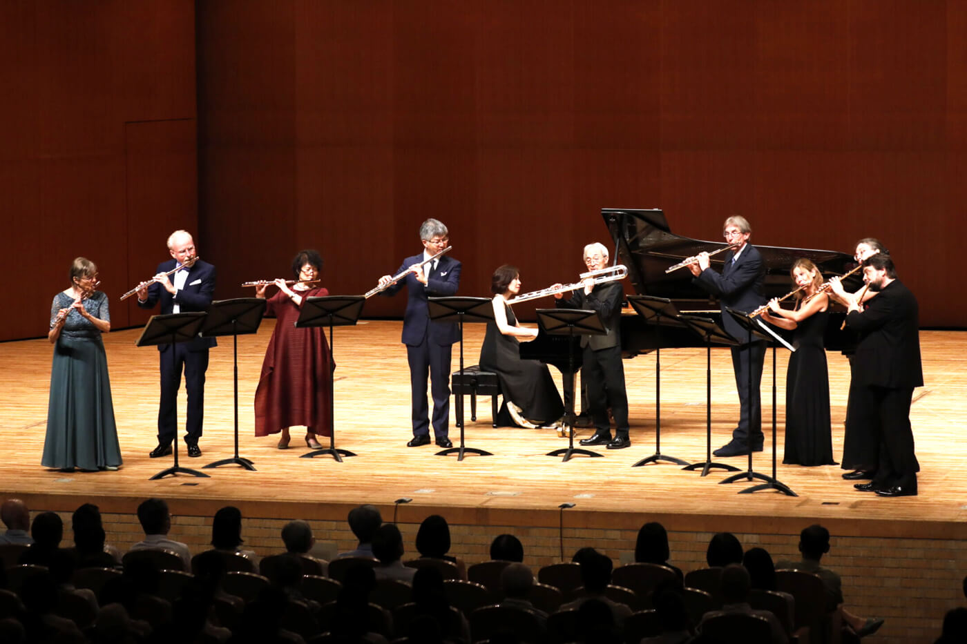 休憩後はリーバークネヒト、酒井秀明、神田寛明の各氏によるドヴィエンヌ『フルート三重奏曲』。それぞれの音色がバランスよく調和し、第3楽章の各パートの掛け合いでは非常に高揚感があった。『夢と小さなワルツ』はレナーテ・グライス=アルミンさんと上野さんで。深みと哀愁のある音色がピアノの和音に溶けていくような「夢」と、音のディティールが場面ごとに変化する「ワルツ」を味わう。マルタン『バラード』を演奏したのはミヒャエル・ファウストさんと鈴木さん。冒頭、フルートもピアノも静かに忍び寄るような表現が魅惑的で、中盤のCadenzaはファウストさんによってグラデーションのようになめらかに奏された。そしてクロンケ『二匹の蝶々』を演奏するのは、オリヴァさん、カレッドゥさん、岡本さん。作品の愛らしさが伝わってくる演奏で、ステージ裏で控える審査員たちも踊っていたのだとか。最後は神田さん編曲の『羊は安らかに草を食み』を、9名の審査員全員と鈴木さんで演奏。酒井さんのバスフルートと、神田さんのアルトフルートが演奏にさらなる厚みを持たせ、澄み切った暖かい響きに会場が包まれた。