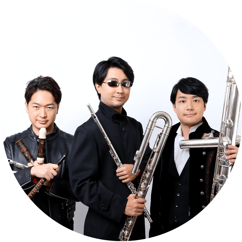 多久潤一朗(写真中央) 無数の特殊奏法、民族楽器の奏法を駆使自作自演を中心に活動中。TV、CM、映画音楽などのレコーディングは年間100本を超え、アニメ「鬼滅の刃」や米津玄師「パプリカ」、Nintendo Switch「スーパーマリオ」「ゼルダの伝説」などのフルート及び和笛、民族笛などを担当している。緊急事態宣言による自粛要請中にはSNSで発信した「ちくわ笛」で有名になり最近もテレビ朝日「題名のない音楽会」などで度々無理難題を課されている。