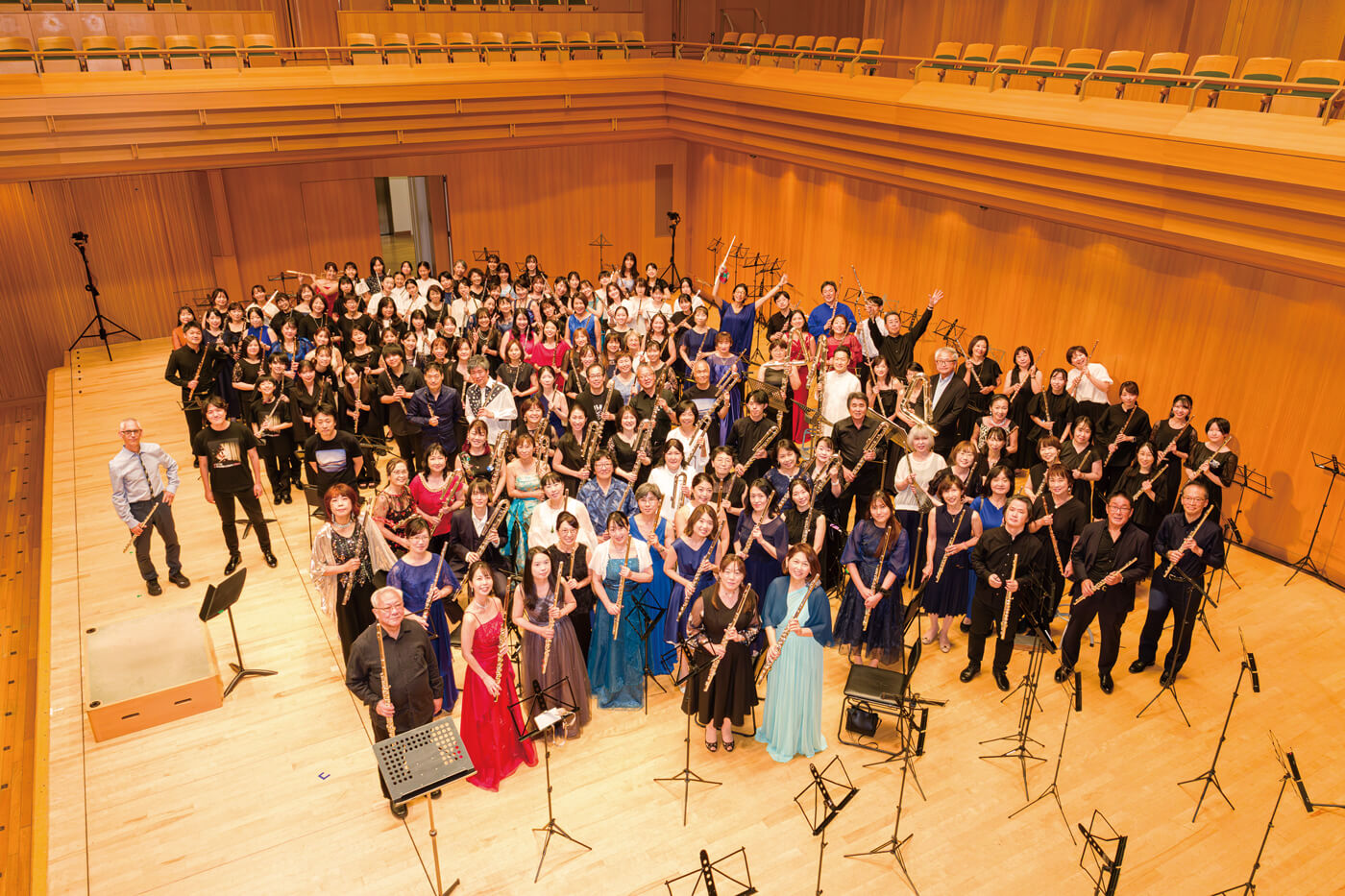 「フルートセレブレーション2025 A late summer dream『晩夏の夢』」の出演者160名と記念撮影。これだけのフルート奏者たちの中で埋もれない音色を奏で、素晴らしい作品を生み出したショッカー氏に、コンサートでは温かい拍手が贈られた