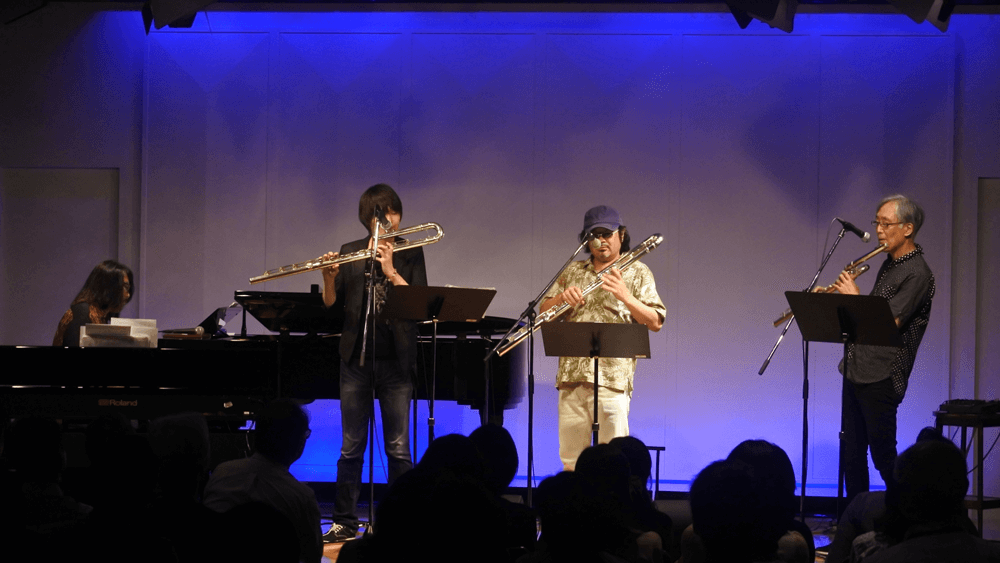 今回のアルバムには、園山光博と尾形誠も参加している。園山は、かつて小田和正のバックバンドで活動していたことでも知られるサックス奏者。フルートは持ち替えで演奏していたものの、「まさか自分がバスフルートだけを持って演奏することになるとは思わなかった」とコメントしていた。尾形は、幅広い演奏活動で若いフルート愛好家たちにも人気のフルーティストだが、やはりバスフルートのみをステージ上で吹き鳴らす姿はかなり新鮮である。