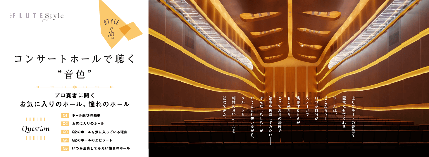 よりフルートの音色を際立たせてくれるホールは、どこだろう?いつか自分が’ステージで演奏するときがもし来たら、とっておきの場所で演奏を披露してみたい――そんな“もしも”が叶うことも想いながら、フルートと相性の良いホールを訪ねてみた。