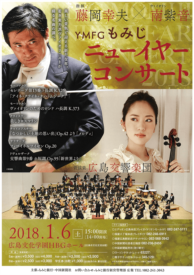 [出演] 指揮:藤岡幸夫、ヴァイオリン:南紫音、管弦楽:広島交響楽団