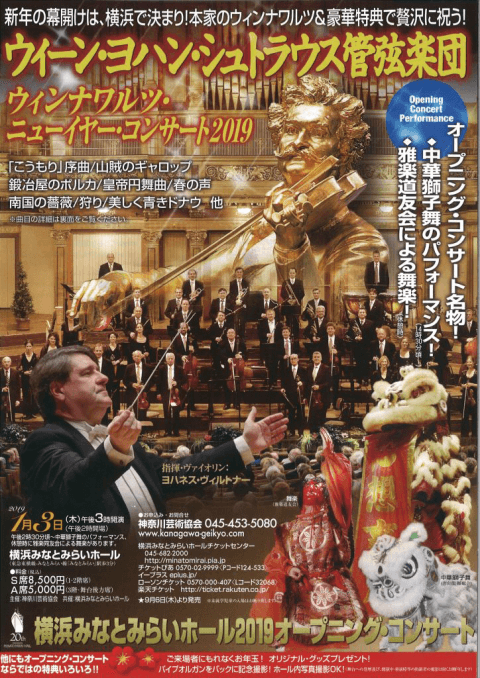 [出演] 指揮&ヴァイオリン:ヨハネス・ヴィルトナー、管弦楽:ウィーン・ヨハン・シュトラウス管弦楽団、唐山龍獅総会(中華獅子舞・開場時予定)、雅楽道友会(舞楽・休憩時予定)