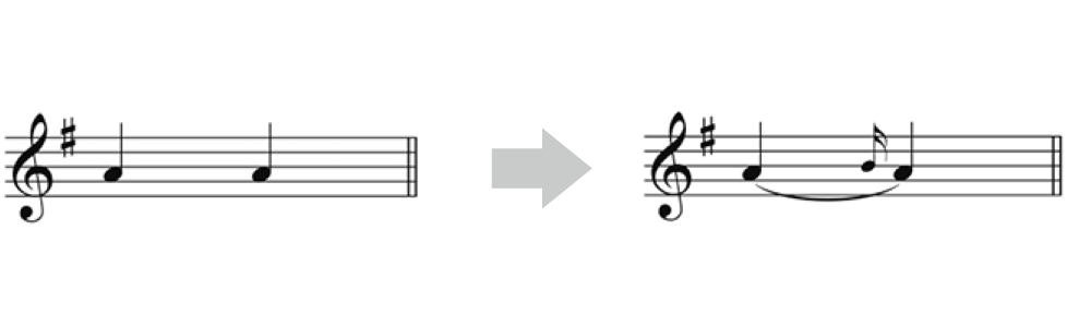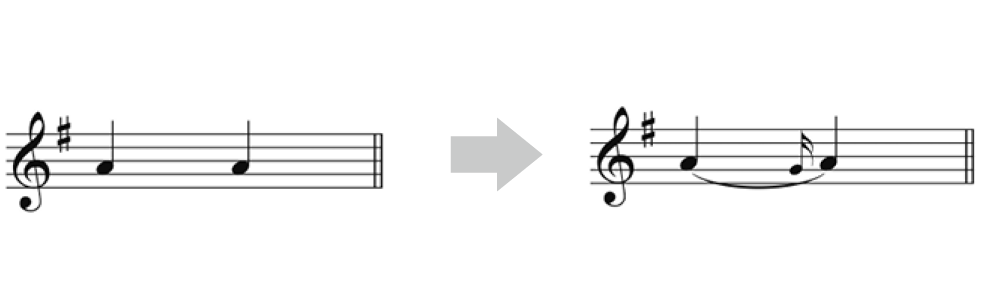 メロディの1つ下の音を素早く挟みます。こうすることで、その音を強調する効果があります。フレーズの始まりや、小節の1拍目などの強拍、フレーズの中の最も高い音などに使うと効果的です。 前打音の長さを調節することで、効果の強弱を変えることができます。