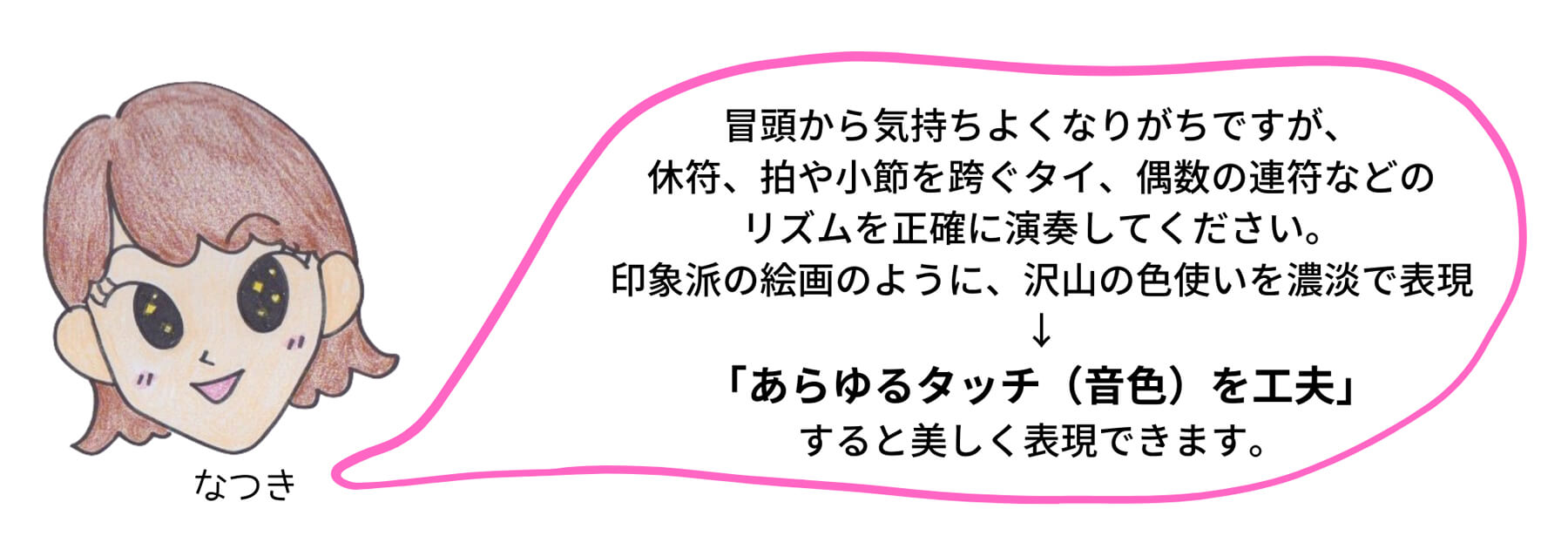 『月の光』は楽譜が読めなくても、音価の細かさ、音符の上下の動きや、強弱、など、記号を一緒に追うだけで楽しいと思います。是非、ピアノ譜を見ながらお楽しみください!!!!!