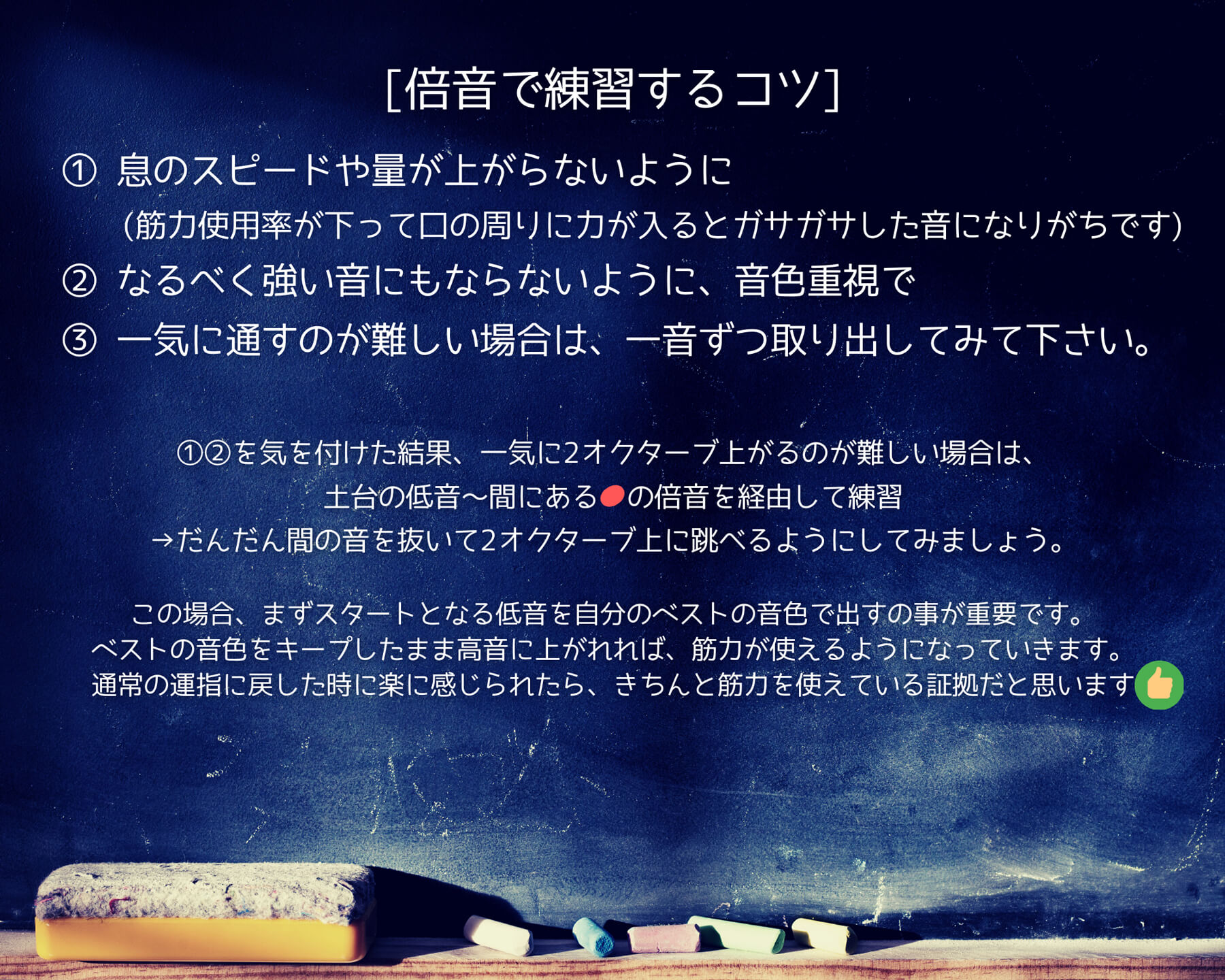 「口周辺〜肩周りの力を抜いてお腹の力で」というのは決まり文句ですが、昨今話題の「骨盤底筋」を意識するのもとっても大事です。お年頃の方は男女問わず(特に経産婦さん)は、きっとフルート以外にもいいことずくめなので、是非チャレンジしてみてください。低音の指遣いで倍音を使った練習なんかも効果的かなと思います。