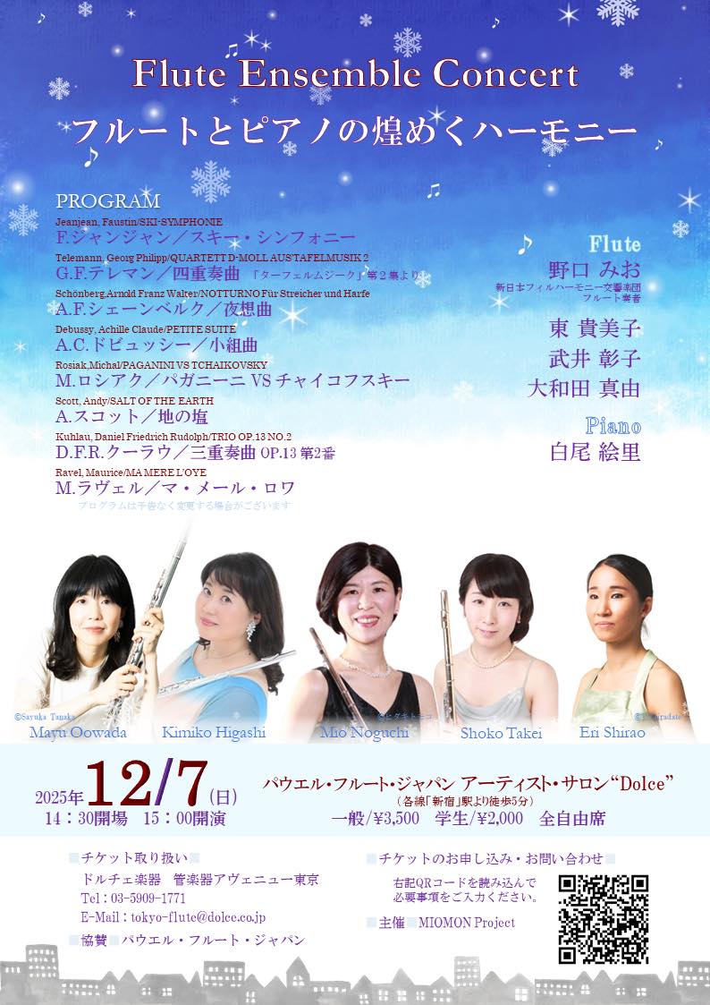[曲目]F.ジャン=ジャン:スキー・シンフォニー、G.Ph.テレマン:四重奏曲 ニ短調「ターフェルムジーク」第2集より WV43:d1、A.F.シェーンベルク:夜想曲、C.A.ドビュッシー:『小組曲』、M. ロシアク:パガニーニ VS チャイコフスキー、A.スコット:地の塩、D.F.R.クーラウ:三重奏曲 OP.13 第2番、M.ラヴェル:マ・メール・ロワ 他(変更する可能性がございます)