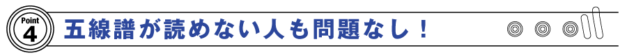 楽譜を読むのが不得意な人のために、本書オリジナルの楽譜を掲載。音名、拍、音の長さ、音の高さがパッと見てわかるようになっています。