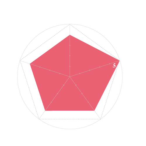 名楽器店の目利き担当者に[音量の大きさ][音色の良さ][操作性の良さ][品質精度の高さ][外観の良さ]の5つの項目について5点満点で採点を依頼。ペンタゴングラフに採点内容を反映。