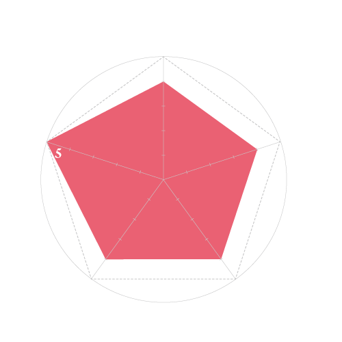 名楽器店の目利き担当者に[音量の大きさ][音色の良さ][操作性の良さ][品質精度の高さ][外観の良さ]の5つの項目について5点満点で採点を依頼。ペンタゴングラフに採点内容を反映。
