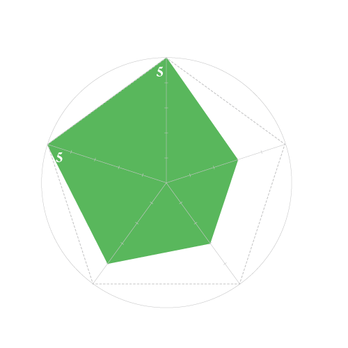 名楽器店の目利き担当者に[音量の大きさ][音色の良さ][操作性の良さ][品質精度の高さ][外観の良さ]の5つの項目について5点満点で採点を依頼。ペンタゴングラフに採点内容を反映。