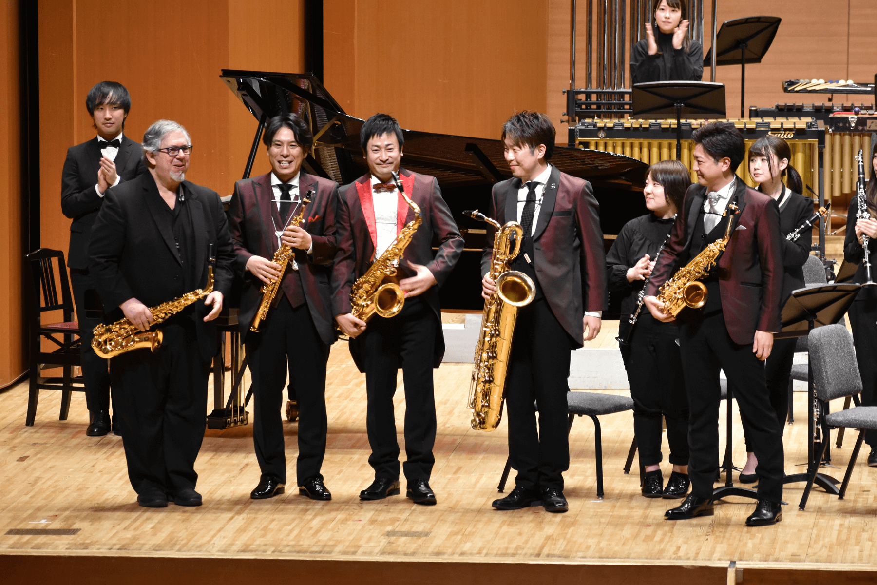 フェスティバルのフィナーレを飾るのは、吹奏楽とサックスによる協奏曲のステージだ。2曲がプログラミングされ、どちらも日本初演となる。まずは先述のコーエン教授をソリストとして迎えた、ダール『アルト・サクソフォーンのための協奏曲』。いわゆる「原典版」とも呼ぶべきこのバージョンの演奏はコーエン教授にしか認められておらず、他に得がたい機会となった。教授はこの曲の被献呈者であるドイツの伝説的奏者、シガード・ラッシャーの門下ということもあり、その音色は日本の奏者とは大きく異なる。きわめて高度な技術を要求するこの作品をラッシャーの伝統を受け継ぐ音色で聴けたことは、参加していた学生やプロ奏者に大いに刺激となったことだろう。