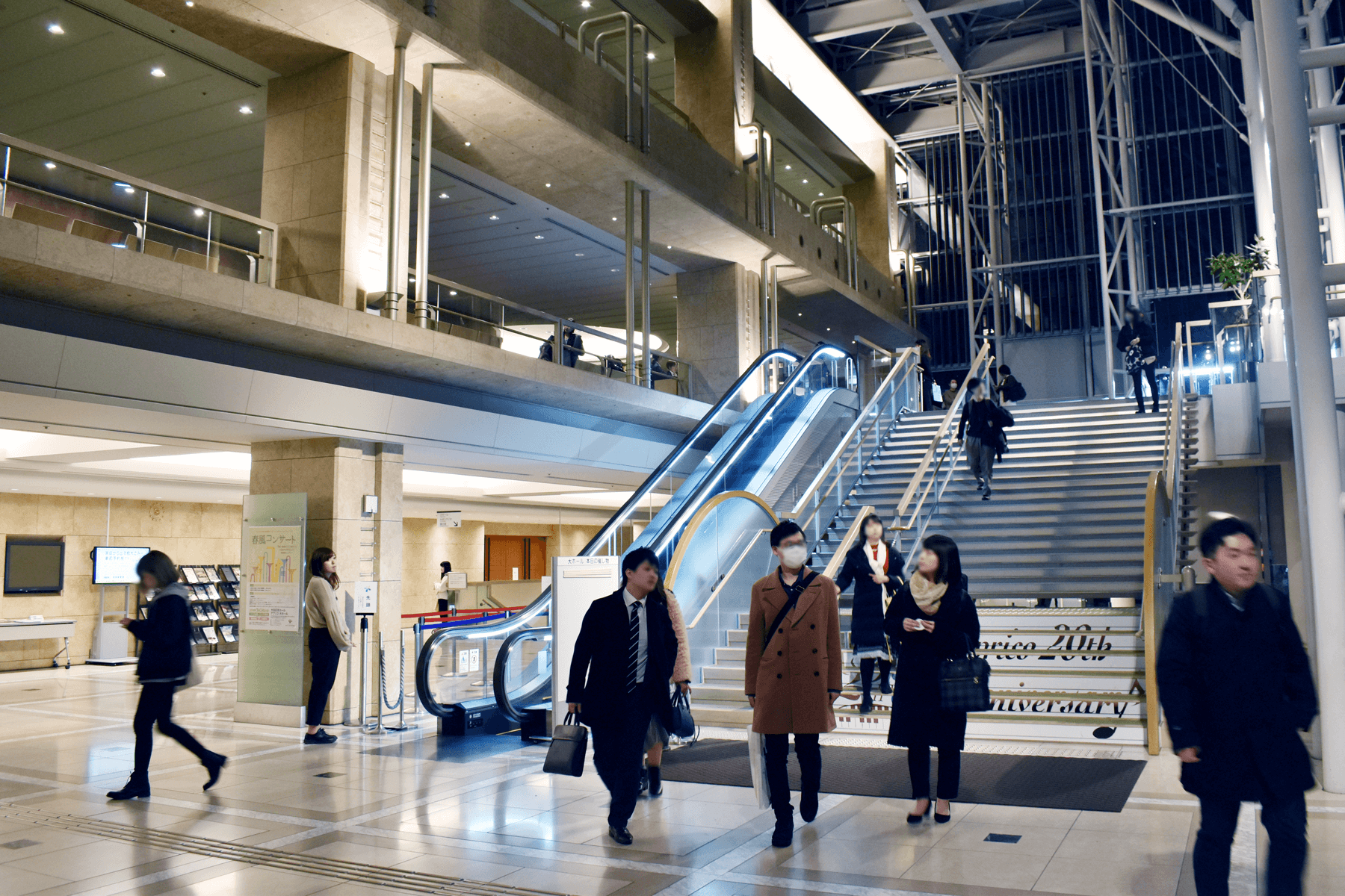 ホールの玄関をくぐり、大ホールの入口がある2階で受付を済ませると、すぐ目の前に楽器メーカー各社の展示ブースが広がる。それぞれの目玉商品に参加者たちは興味津々の様子だ。