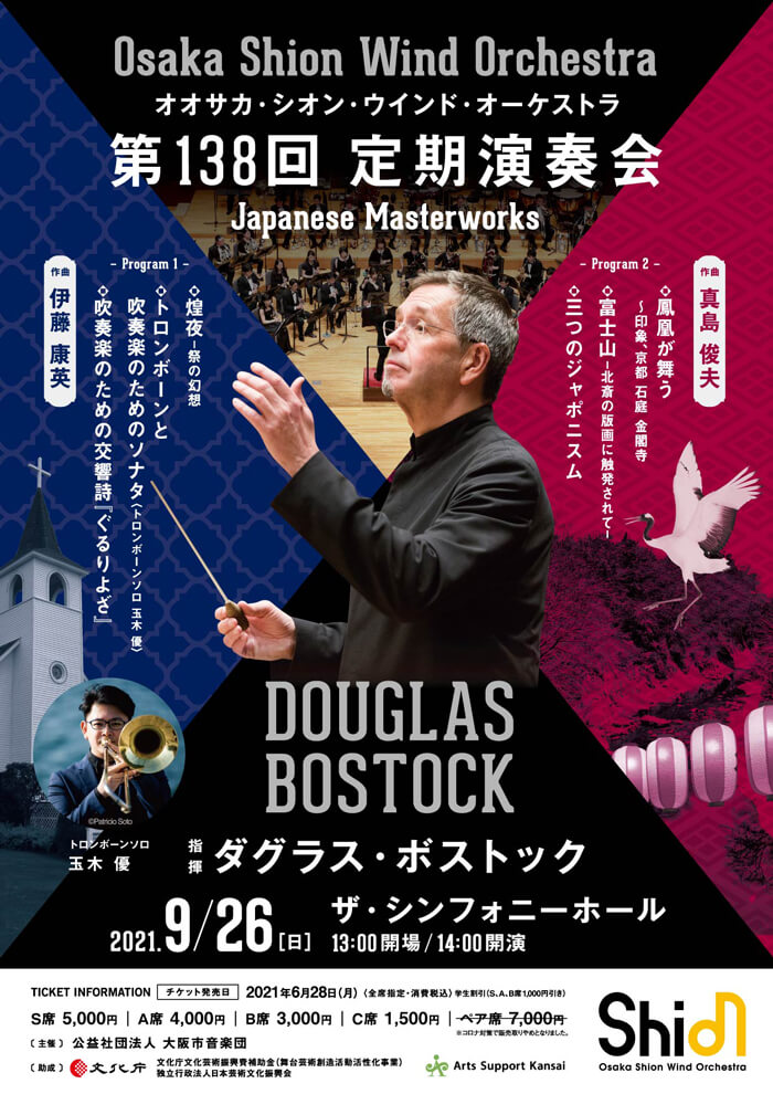 日本に造詣の深いダグラス・ボストックがタクトを振るオオサカ・シオン・ウインド・オーケストラの第138回定期演奏会は、「Japanese Masterworks」と題して、伊藤康英と真島俊夫という二人の日本を代表する作曲家の作品を演奏する。第一部は伊藤康英シリーズで新作ソナタや『ぐるりよざ』など和洋折衷の内容。第二部は真島俊夫シリーズで『三つのジャポニズム』などが演奏される。