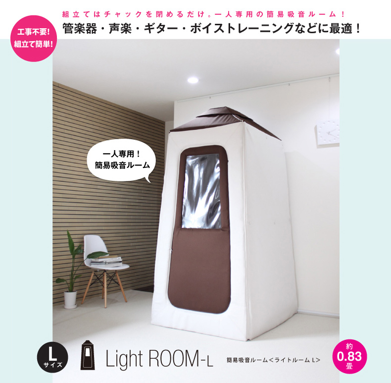 室内に設置するタイプの吸音ルームです。ROOM内部の吸音効果により楽器の音量を抑えます。遮音性の高い住宅にお住まいだけど、隣家や隣室への音漏れを更に和らげたい方。家族など同居者に対しての音漏れを軽減させたい方など、本格的な防音ルームではなく、お手軽に吸音をして音漏れを軽減させたい方にオススメです。圧迫感や違和感を感じさせないシンプルなデザインとコストパフォーマンスの高さで人気の商品です。Lサイズは幅105×奥行120cm(約0.83畳)で、フルートなど、演奏する際幅を必要とする楽器にピッタリなサイズ。※注:簡易吸音ルームのため、完全な防音をご希望の方にはオススメ致しません。ご注意ください。