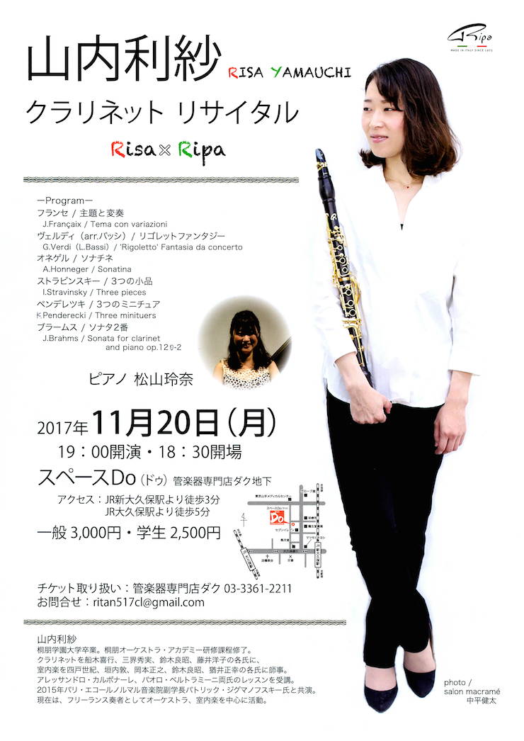 クラリネット奏者、山内利紗さんのクラリネットリサイタルがこの秋、スペースDo(新大久保)にて開催予定です。
