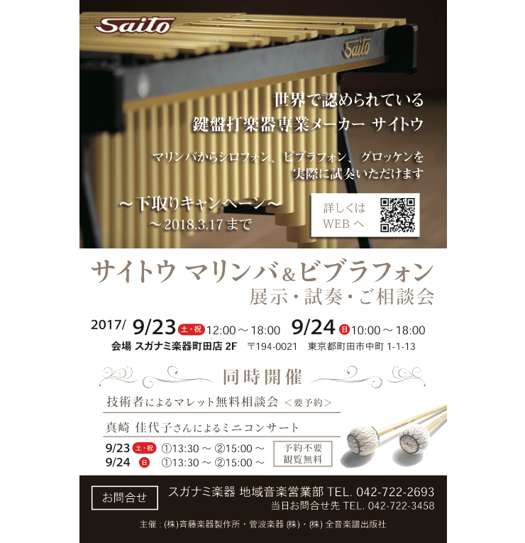 世界で認められている鍵盤打楽器専業メーカーのサイトウが、マリンバ、シロフォン、ビブラフォン、グロッケンを一同に集めた展示・試奏会をスガナミ楽器町田店で開催します! 今年2月にはじめて開催され好評だった企画の第2弾♪ 今回はフリーで活動しながらレッスンも行なっているマリンビスト 真崎佳代子さんのミニコンサートあり、マレット無料相談会あり。いずれも参加無料ですのでお気軽に♪