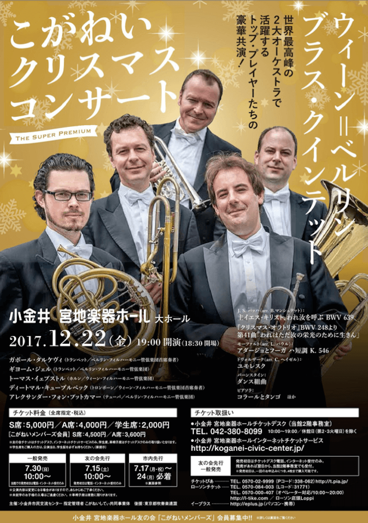 世界最高峰オーケストラ、ベルリン・フィルから、ガボール・タルケヴィ(Tp)(首席奏者)とギョーム・ジェル(Tp)、アレクサンダー・フォン・プットカマー(Tub)、そして伝統のオーケストラ、ウィーンフィルから、ディートマル・キューブルベック(Tb)とトーマス・イェプストル(Hn)、5名の最強の精鋭がオーケストラの垣根を越えて集結します。ぜひ一流の演奏をご堪能ください。