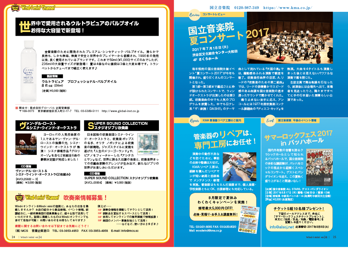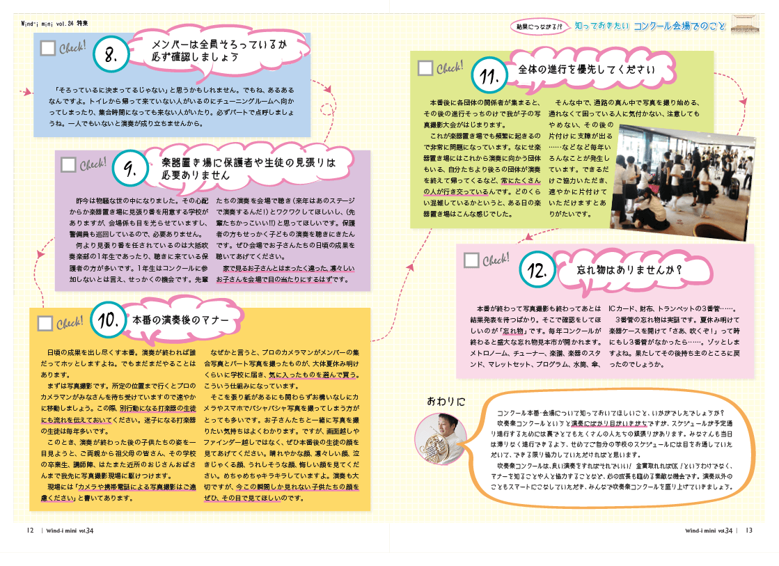 さて今号も“ためになる”内容を掲載! 特集には知って得する情報「会場マナー」について、ホルン奏者の権左勇一さんに教えていただきました。コンクール会場ではたくさんの団体が行き交います。「ちょっとくらい良いだろう……」と思っても、相手にとっては大きな迷惑だったりするものです。当日の段取りについても要チェックしておきましょう。
