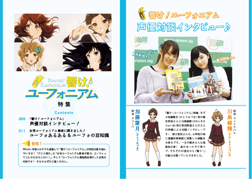 今回は、いよいよスタートしたTVアニメ「響け!ユーフォニアム」特集です。「声優対談インタビュー♪」と「女性ユーフォニアム奏者に聞きました! ユーフォあるある&ユーフォの豆知識」の2つの企画で、アニメを詳しく紹介しつつ、ユーフォニアムの魅力にも迫ります。