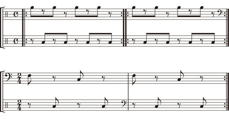 基礎練習は決して楽しいものではないのですが、どんなことでも上達するために必要な練習や訓練は必ずあるものです。まずやってほしいのは開放弦でのボウイング。これは管楽器のロングトーンに相当する大切な練習です。楽器をまっすぐ構えて全身をリラックスさせたら、メトロノームを=60でかけながら全音符を弾きます。 その時に毛の一番根元から一番先まで、弓が正しい位置(指板の端と駒の中間)からずれないように注意します。音が揺れたり音量が変わらないように気をつけましょう。一定の音で弾けるようになってきたらテンポを落とします。ゆっくりになればなるほど音を保つのは難しくなります。テンポ=40で8拍伸ばせるようになればかなり安定していると言えるでしょう。 次にリズム感を鍛える練習です。メトロノームを=60でかけながら拍のウラで手を叩くか膝を叩きます。ウラ打ちがうまくできるようになってきたら、それを続けながら頭の中だけでオモテとウラを入れ換えます。つまり自分がオモテ拍でメトロノームがウラ拍になるようにするのです。ちょうどマーチのベースとスネアの関係と同じですね。 手拍子でできるようになったら楽器でやってみます【譜例①】。2/4拍子で1拍目にファを、2拍目にドを弾いて、間にメトロノームのウラ打ちが入るように弾きます。