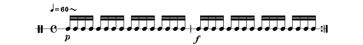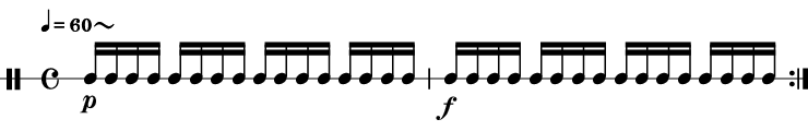 (2)リズム(16分音符など)を叩きながら奥側から手前へ、左側から右側へなど、叩く場所を移動させても音量の変化やリズムの乱れ、音抜けのないように(譜例①)。