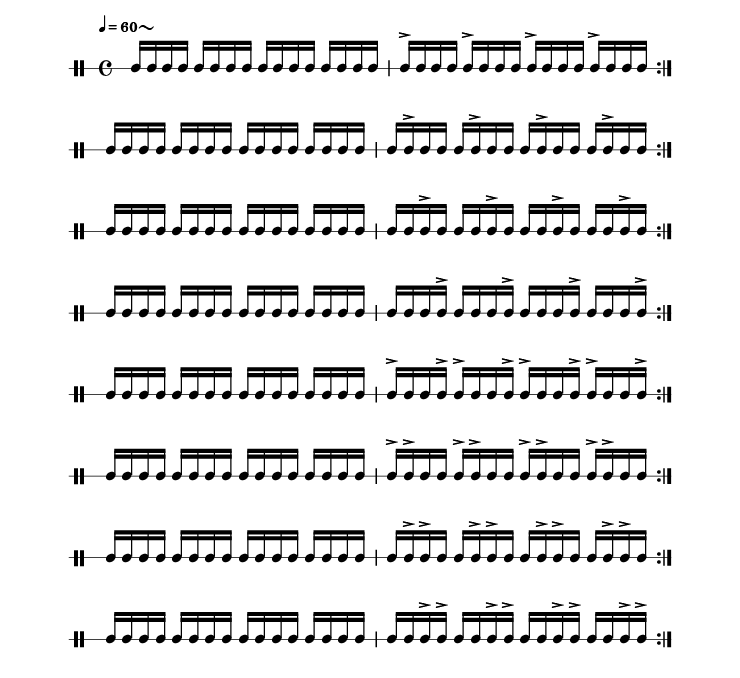 ゆっくりなテンポから始め、リズム全体の音量、強弱の差を考えながらスティックを効率よく動かすこと。アクセントの練習は強弱をつけることだけでなく、リズムのニュアンスをつけることに繋がります。